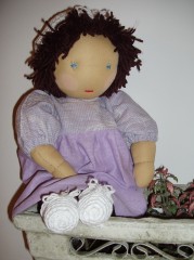 Sramežljiva djevojčica u ljubičastoj haljini, obogaćena heklanom kapom od bijelog konca i papučicama.
